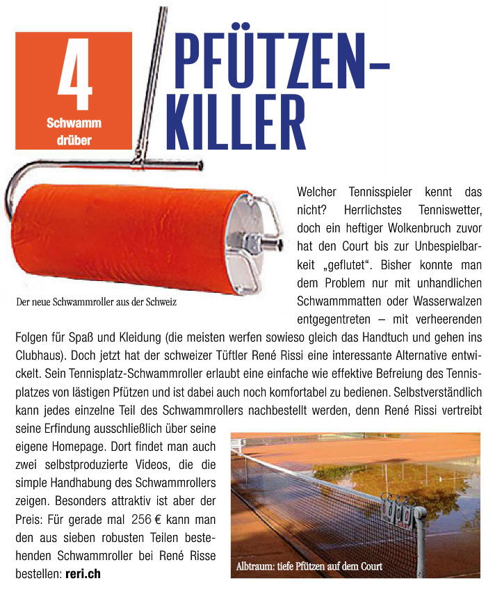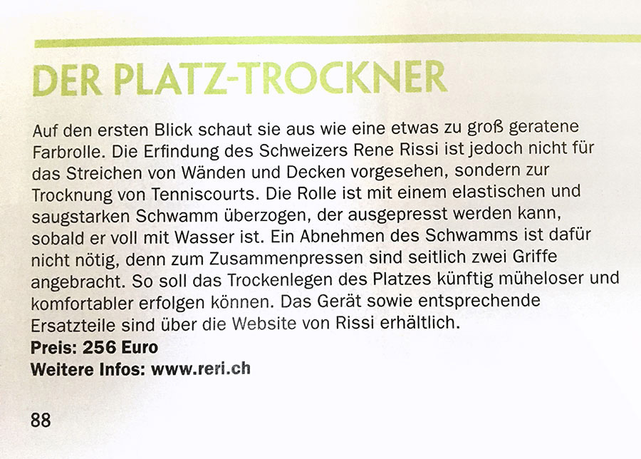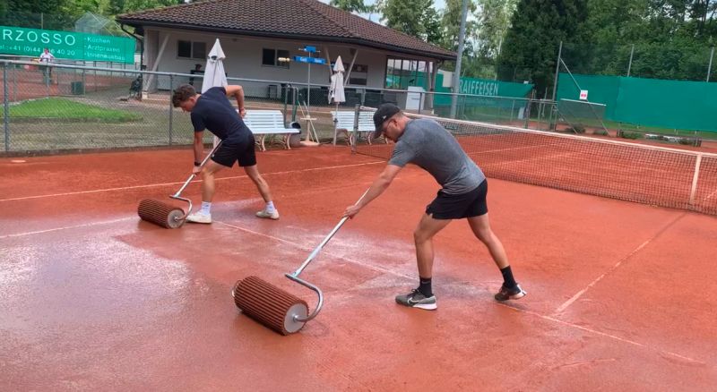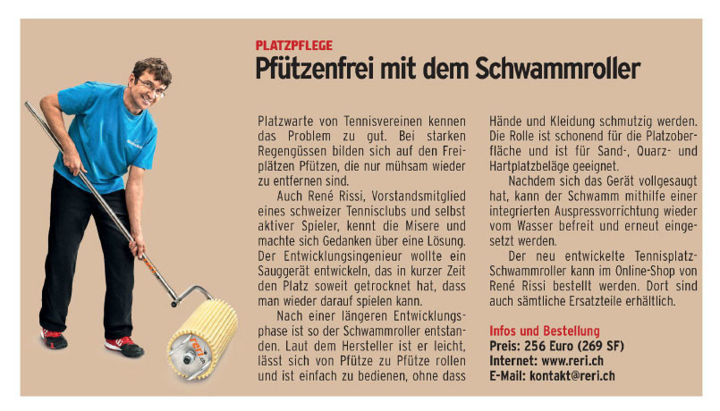 Grâce à notre produit unique, vous pouvez profiter de vos heures de sport sur le court de tennis malgré les averses et les flaques d'eau. Notre produit est conçu pour absorber efficacement l'eau sans que d'autres matériaux n'adhèrent à l'éponge. Cette propriété fait du rouleau éponge le produit idéal pour une utilisation sur les courts en terre battue souvent préparés avec de la poudre de brique. Mais le rouleau éponge absorbant peut également être utilisé de manière optimale sur les courts de tennis en quartz ou en dur. Le matériau de l'éponge est constitué de granulés spéciaux de haute qualité, qui permettent d'absorber et de retenir de grandes quantités d'eau sur le court de tennis. L'eau absorbée peut être facilement extraite de l'éponge à tout moment par pressage mécanique. L'eau s'écoule alors verticalement et vos mains restent propres et sèches. Grâce à la forte tension interne du matériau, l'éponge reprend toujours sa forme cylindrique d'origine, même après avoir été pressée plusieurs fois. La petite taille de l'éponge (diamètre : 23 cm, largeur : 50 cm) permet de l'utiliser même sur les surfaces les plus petites. Les petites flaques d'eau sur votre court de tennis, comme celles entre le banc et les poteaux du filet, peuvent ainsi être facilement atteintes et séchées. De plus, le poids total du produit est limité à 4,9 kg. Ce produit se distingue ainsi comme le rouleau éponge le plus maniable du marché. Notre produit suisse innovant est protégé par un brevet. Le rouleau éponge pour courts de tennis est entièrement fabriqué en Suisse et peut donc porter le label Swiss Made.